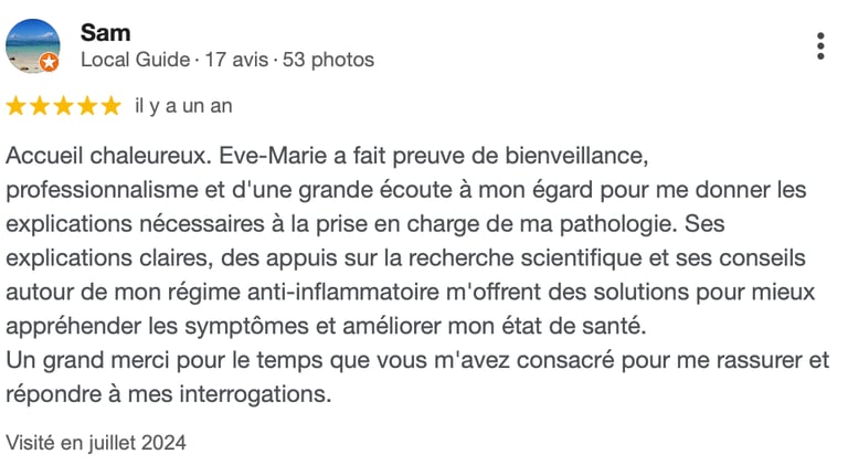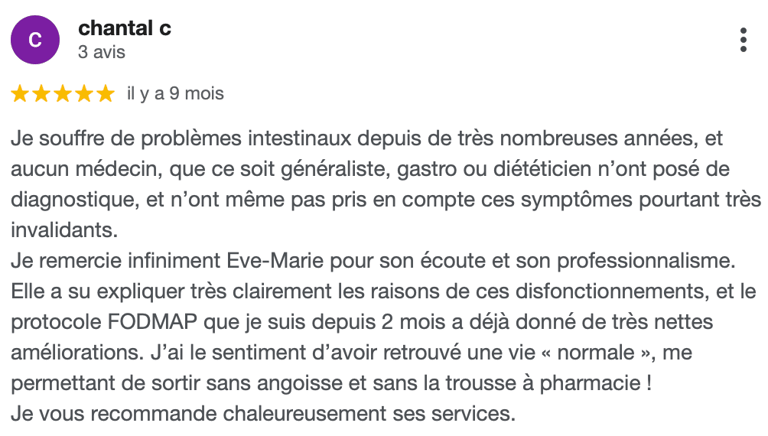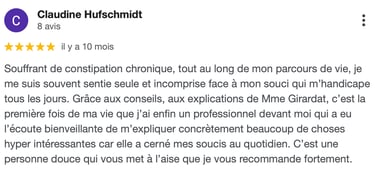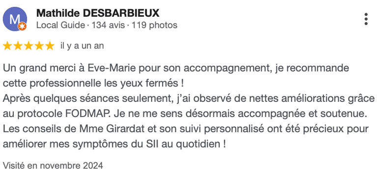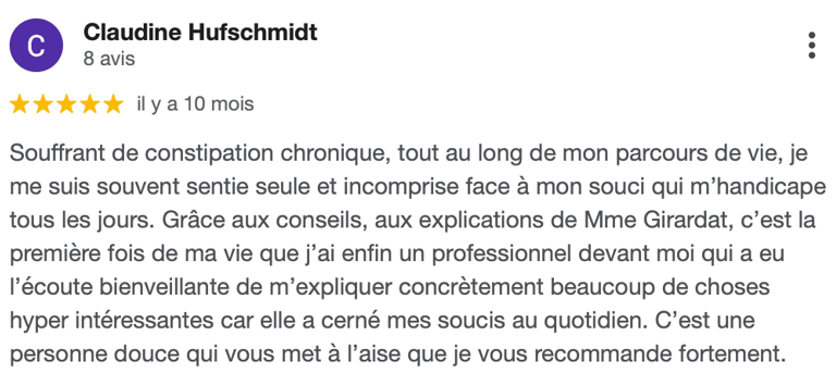 Ces avis proviennent directement de ma fiche Google Professionnelle et reflètent une prise en charge individualisée, bienveillante et basée sur les recommandations scientifiques.